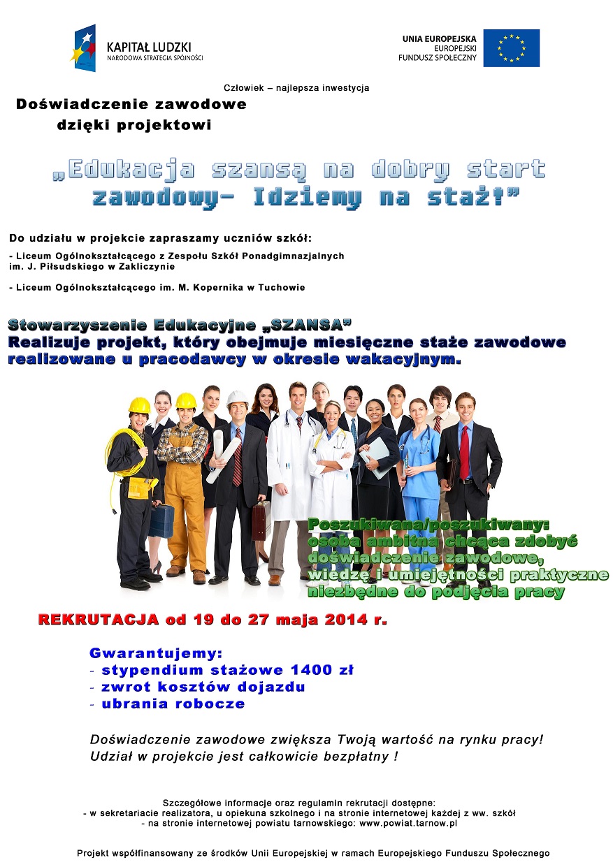 Już 19 maja 2014 roku rusza projekt: "Edukacja szansą na dobry start zawodowy – Idziemy na staż!", współfinansowany ze środków Unii Europejskiej w ramach Europejskiego Funduszu Społecznego, Działanie 9.5 Program Operacyjny Kapitał Ludzki, w ramach którego uczniowie będą mogli odbyć wakacyjny płatny staż zawodowy. Regulamin rekrutacji będzie zamieszczony 19 maja 2014 r. na stronie szkoły i w zakładce Stowarzyszenia Edukacyjnego „Szansa”. Prosimy o śledzenie tych informacji na stronie.