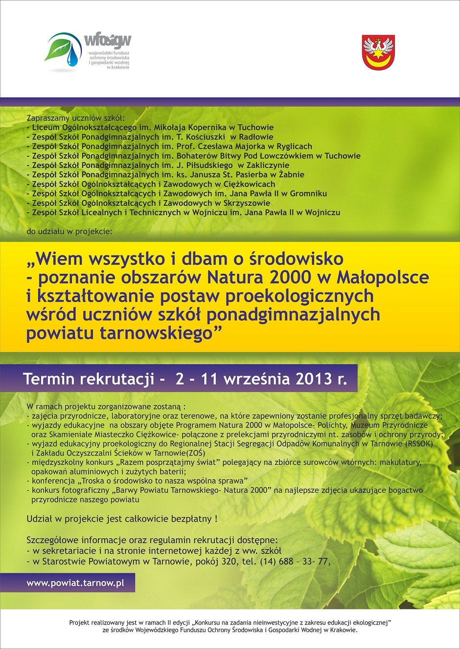 W dniu 2 września rozpoczęła się realizacja projektu „Wiem wszystko i dbam o środowisko – poznanie obszarów Natura 2000 w Małopolsce i kształtowanie postaw proekologicznych wśród uczniów szkół ponadgimnazjalnych powiatu tarnowskiego” dofinansowanego z Wojewódzkiego Funduszu Ochrony Środowiska i Gospodarki Wodnej w Krakowie. |